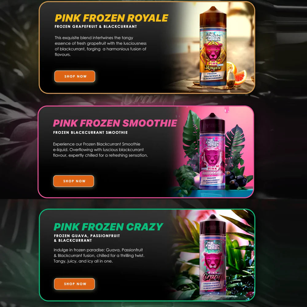 Pink Frozen Smoothie Experience our Frozen Blackcurrant Smoothie liquid. Overflowing with luscious blackcurrant flavour, expertly chilled for a refreshing sensation